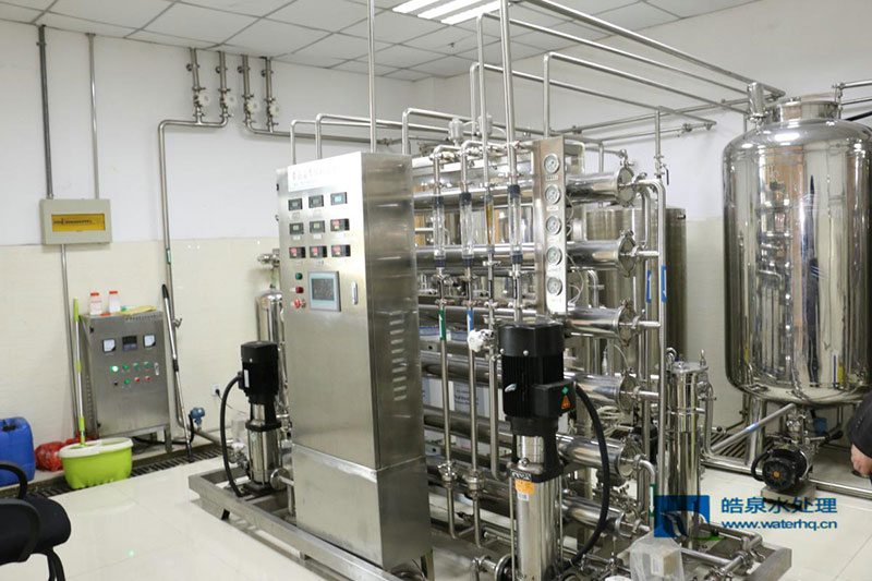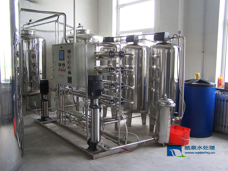 原水-原水加壓泵-多介質過濾器-活性炭過濾器-軟水器(或阻垢加藥裝置)-精密過濾器-第一級反滲透-PH調節-中間水箱(可選)-第二級反滲透(反滲透膜表面帶正電荷)-純化水箱-純水泵-紫外線殺菌器-微孔過濾器-用水點