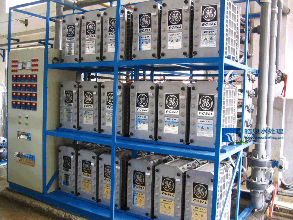 當進水中的 Na+及 CI-等雜質離子吸咐到相應的離子交換樹脂上時,這些雜質離子就會發生象普通混床內一樣的離子交換反應,并相應地置換出 H+及 OH-。一旦在離子交換樹脂內的雜質離子也加入到 H+及 OH-向交換膜方向的遷移,這些離子將連續地穿過樹脂直至透過交換膜而進入濃水室。這些雜質離子由于相鄰隔室交換膜的阻擋作用而不能向對應電極的方向進一步地遷移,因此雜質離子得以集中到濃水室中,然后可將這種含有雜質離子的濃水排出膜堆。
